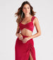 You'll always be dressed to impress in this satin pleated top featuring a sleeveless V-neck. wide straps. a center-ruched bust seam. and a fitted crop hem. Style with the matching skirt for a night of dinner and dancing!