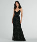 Step into the garden of sultriness in the Aly formal long dress! She captivates everyone in her plunge V-neckline. a padded bust.  spaghetti straps that lace up in the back. and a flattering mermaid silhouette and floor-length hem. The formal long dress is designed with a flocked floral pattern on mesh fabric and has a stretchy full knit lining. Complete the look in a sleek lariat necklace for a black tie formal event!