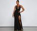 Strike a pose in a formal dress that leads the way! The dress features a sleeveless V-neckline with a notched accent. satin bodice. a cutout at the midriff. spaghetti straps that cross at the back. and a high side slit. The dress is composed of a crepe fabric that offers a form hugging fit with a moderate stretch. Complete look with a rhinestone bracelet.Â