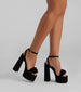 Elevate your evening out look with these stunning platform heels! They feature an almond toe. a floral and beaded embellished toe strap. a chunky platform sole and block heel. and an adjustable ankle strap with buckle closure on faux suede material. Style with an envelope clutch for a black tie occasion!