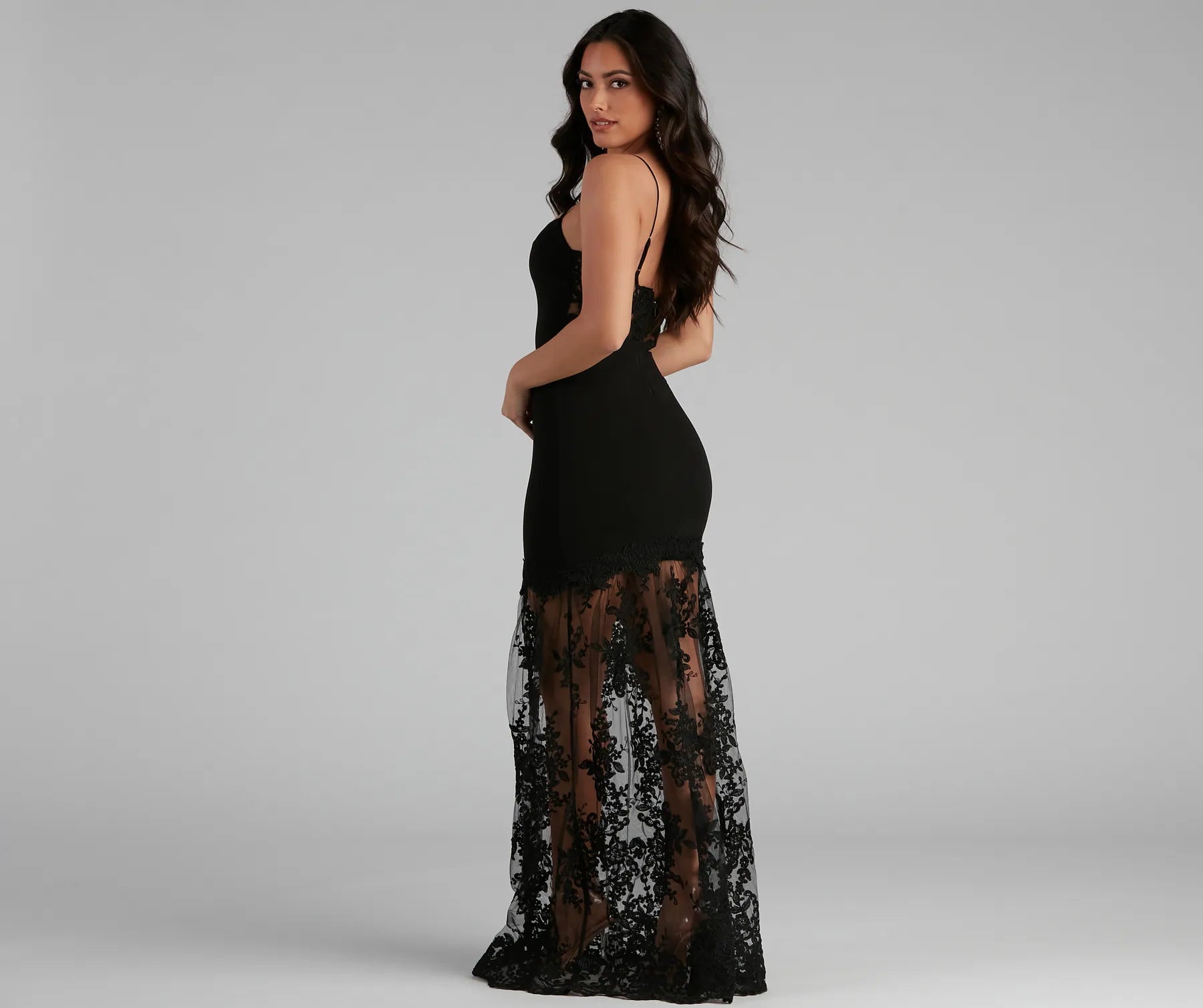Anahi brings sophistication to the party in a floor-sweeping mermaid silhouette that's sure to catch everyone's eyes. She features a sleeveless. square neckline and adjustable straps on a fitted bodice. It flows into a detachable floral lace skirt that you can remove to convert her into a sultry mini dress for all-night dancing. The dress is composed of a combination of crepe and lace fabric with minimal stretch. Complete your chic look with a glamorous necklace set.