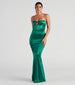 Dazzling rhinestone trim heats up the Analynn formal satin dress for your next black tie gala or wedding! She features a sleeveless scoop neck with a flirty twist and keyhole accent. adjustable spaghetti straps to customize her fit. and an empire waist seam. Her form-hugging mermaid silhouette gently flares out into the floor-length hem that elongates your figure! The formal dress is composed of silky satin fabric with a sewn-in lining and minimal stretch. Complete your dressy look with a chic rhinestone clutch and bracelet.