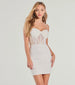 Cause sparkling commotion at your next formal party in the Andi heat stone corset dress! Stun the room in this sleeveless bodycon dress featuring a sweetheart neckline. adjustable spaghetti straps for a customized fit. a corset-style sheer bodice with flexible boning. and side ruched seams along the bodycon silhouette. The partially lined mesh fabric features all-over mini heat stone embellishments. Complete your sultry look with a rhinestone fringe hair accessory.