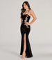 Evoke a romantic aura in the gorgeously chic Angelica velvet mermaid dress designed with intricate floral embroidered appliques down the front. Perfect for a formal affair. the dress features a sleeveless square neckline accented with a V-wired insert. adjustable spaghetti straps leading to a cross-back design. and a high-cut front slit on the fitted mermaid silhouette.