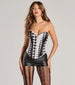 Stay stylishly rebellious this Halloween with a bold corset top that features a strapless plunging sweetheart neckline. hook and eye front closures. a satin lace-up back for a customized fit. and a checkered diamond pattern. Complete your costume with the hot shorts. sheer tights. and combat boots.