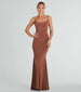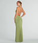 Simply chic. the Anya strappy open-back mermaid dress will turn heads at your next formal event. Designed with a sleek and stretchy knit fabric. she features a sleeveless cowl neckline. spaghetti straps. an alluring open back with a cross-back strappy design. lower back ruching to accentuate your curves. and a floor-length hem with a stunning mermaid silhouette. Style this formal long dress with dainty duster earrings for a subtle hint of glamour.