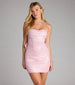 The April mini dress is your RSVP-ready spotlight stealer. crafted in glitter knit fabric with a sculpted bodycon fit. Its corset bodice creates a striking silhouette. while the oversized statement back bow leaves a lasting impression on every exit.