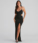 Showcase your elegant style with a formal dress that dares to be bold. Ara features a sleeveless V-neckline. spaghetti straps that lead to the open strappy back. and dual waist cutouts. Her bodycon silhouette is accented with a high side slit along the floor-length hem. Ara is composed of a lined crepe fabric that offers a moderate stretch. Complete formal outfit with rhinestone heels and a sphere clutch.