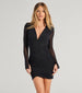 Live the luxe life at your next formal party in the Aria mini dress designed with lined mesh fabric and all-over rhinestone embellishments for a gorgeous sheen. It features a V-neckline. sheer long fitted sleeves with slit hems. shoulder pad accents for a bold look. and a ruched wrap-front design on the short bodycon silhouette.