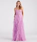 Feel like absolute royalty in the dreamy Ariana ruffled mesh formal dress that will create an enchanting look for any fancy affair! She features a strapless sweetheart neckline. a fitted bodice with flexible boning inserts to provide structure and ruched detailing. a high waist seam. a floor-sweeping hem with a tiered ruffled mesh design. and a flowy A-line silhouette. The airy lightweight mesh fabric includes a full-length knit lining. Complete the look with radiant rhinestone earrings.