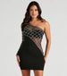 Sparkle up the room in the stunning Arianna formal mini dress that brings the glitz and glamour! She features an asymmetrical one-shoulder neckline with a single sheer long-fitted sleeve. a sheer unlined mesh top with an asymmetrical cut design. iridescent rhinestone embellishments in a woven pattern. and a short crepe bodycon skirt. The mesh and crepe fabrics offer a moderate stretch. Complete your luxe look with strappy heels for a night out.