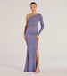 The long glitter mermaid dress features a one-shoulder neckline. a fitted long sleeve. and a high-side slit. Complete formal outfit with sleek rhinestone clutch.Â