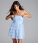 This strapless party dress features a flattering A-line silhouette with a ruffled short-length hem for a flirtatious allure. The glitter rhinestone embellished mesh fabric offers a sparkling look at the school dance or birthday party.