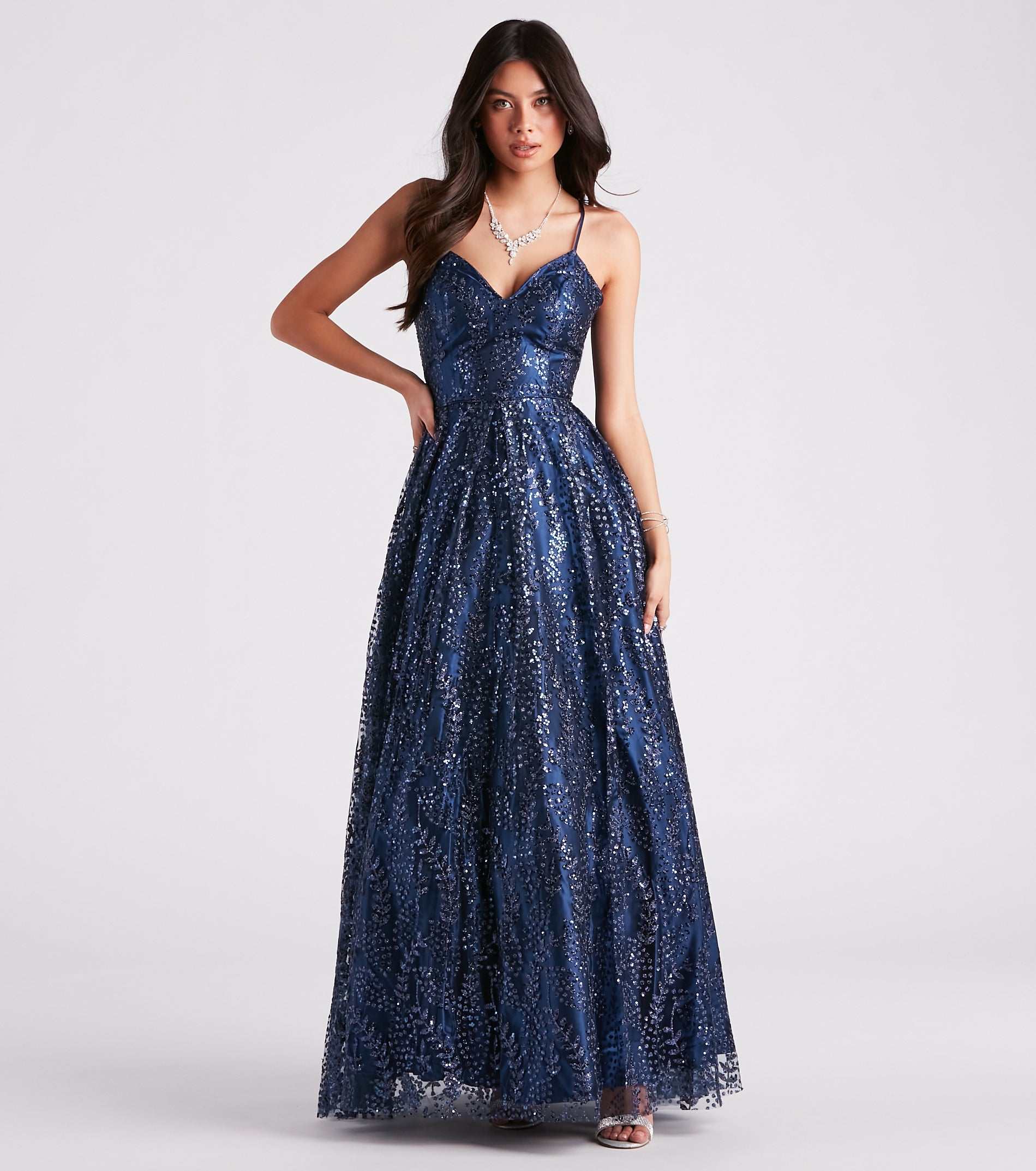 With the Arleth ball gown. you'll be sparkling all night long! This gown will make your princess dreams come true with a flirty open lace-up strappy back that turns heads and convenient side pockets on a flattering A-line silhouette.