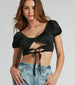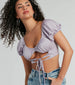 The cutest satin crop top for wearing all around town! Play up your flirty side in this top featuring adorable puff short sleeves and a scoop neckline that flaunts your bust. The dual front ties are adjustable for the perfect fit while the cutouts flash some skin along the cropped hem. Complete the look in high-rise jeans and sandals for a fresh vibe!