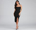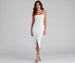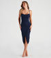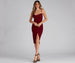 A formal midi dress is the perfect go-to for that upcoming cocktail affair or as a wedding guest. Wow in the captivating Ashlyn dress features a flattering cowl neckline. spaghetti straps that lead to a cross-back design. and a high waist seam. She's designed with a gorgeous wrap bodycon silhouette with a front slit accent and a midi-length hem. The dress is composed of a lined crepe fabric with a moderate stretch. Complete your formal outfit with rhinestone heels and a tennis bracelet.Â