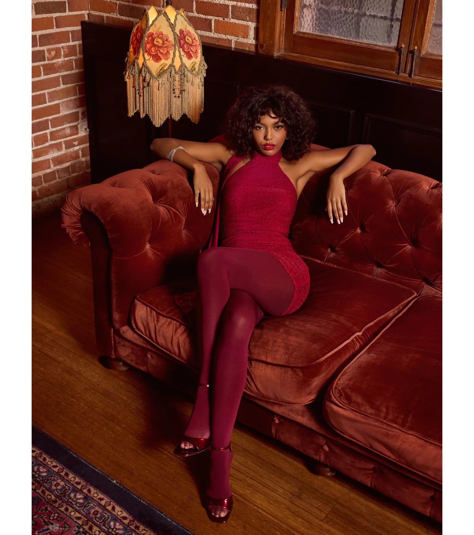 Chic with a glam allure. the Ashton mini dress is glitzy perfection with its all-over rhinestone embellishments that will shine at your next formal party. It features a sleeveless mock neckline with a long cascading neck tie. ruched side and back seams to accentuate your gorgeous curves. and a short bodycon silhouette.