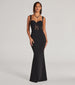 This crepe formal dress features a flattering sweetheart neckline with a built-in padded underwire bust. a lace trim bodice. and a stunning mermaid floor-length silhouette. Perfect for styling with a necklace.
