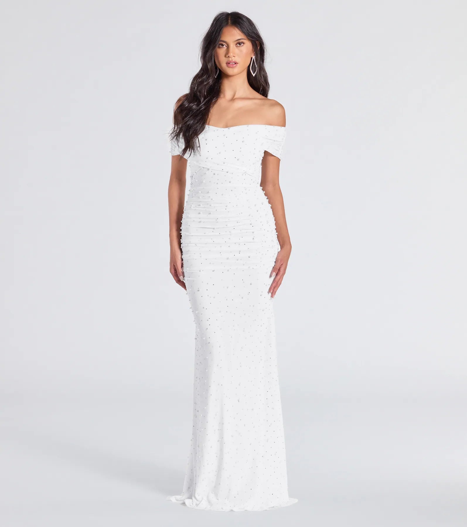 Create an enchanting formal look in the Aubriella mermaid dress crafted with a lined mesh fabric embellished with mini iridescent rhinestones and faux pearls for a gorgeous shimmer. The dress features a feminine off-the-shoulder neckline with short sleeves. a wrap front and back design at the bodice. ruched side seams to accentuate your curves. and a floor-sweeping mermaid silhouette.