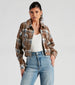 This trendy plaid cropped shacket is perfect for those chilly autumn nights. It features a collared neckline. long sleeves. a complete button-down front. flap pockets. and a cinched elastic back. Layer over a long sleeve top and pair with your fave jeans for a cute and casual vibe.