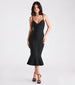 Achieve a sexy silhouette that will showcase your natural curves in the stunning and chic Aya formal midi-length bandage dress. She features a sleeveless sweetheart neckline. adjustable spaghetti straps for a customized fit. and a hidden back zipper closure. Her vertical seam detailing continues down the length of the dress meeting with a high waist seam and a midi-length seam with a ruffled hem. The bandage knit fabric offers a bodycon silhouette for a smooth and sculpted look with plenty of stretch. Complete your outfit with lace-up heels for your next cocktail party.