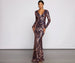 Stun a sequin dress that brings the shimmer to your special night. The Ayla formal dress features a plunging V-neckline. long sleeves. a sequin scroll print. and a curve-hugging mermaid silhouette. Complete your look with a rhinestone clutch and rhinestone barrettes to style dresses with.