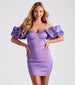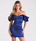 The Azalai satin short dress brings flirty allure with voluminous fun! She features an off-the-shoulder. sweetheart neckline with non-slip grip lining. ruffled elasticized sleeve cuffs. a padded bust. and a form-hugging short-length hem. The formal mini dress is composed of a metallic-like taffeta woven fabric with minimal stretch and a lined bust. Style with stiletto heels and a clutch to complete the look!