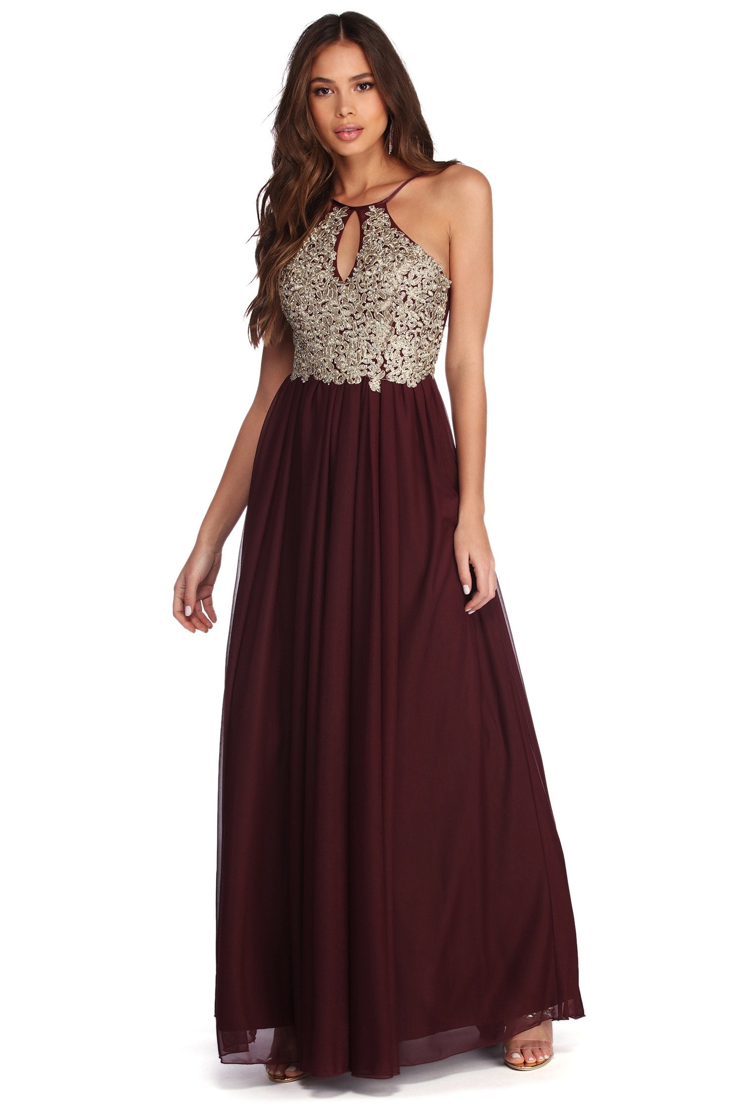 Step in as the center of attention as you stun in our Azalea dress! She features a combination plum with gold hue. a sleeveless bodice. a high round neckline. padded cups. a small keyhole. narrow straps and a gold hued floral applique design. Her back features an open back with a sheer unlined mesh panel. Her slim fit bodice leads to a elongating floor length silhouette.Dress offers a relaxed fit with minimal stretch.