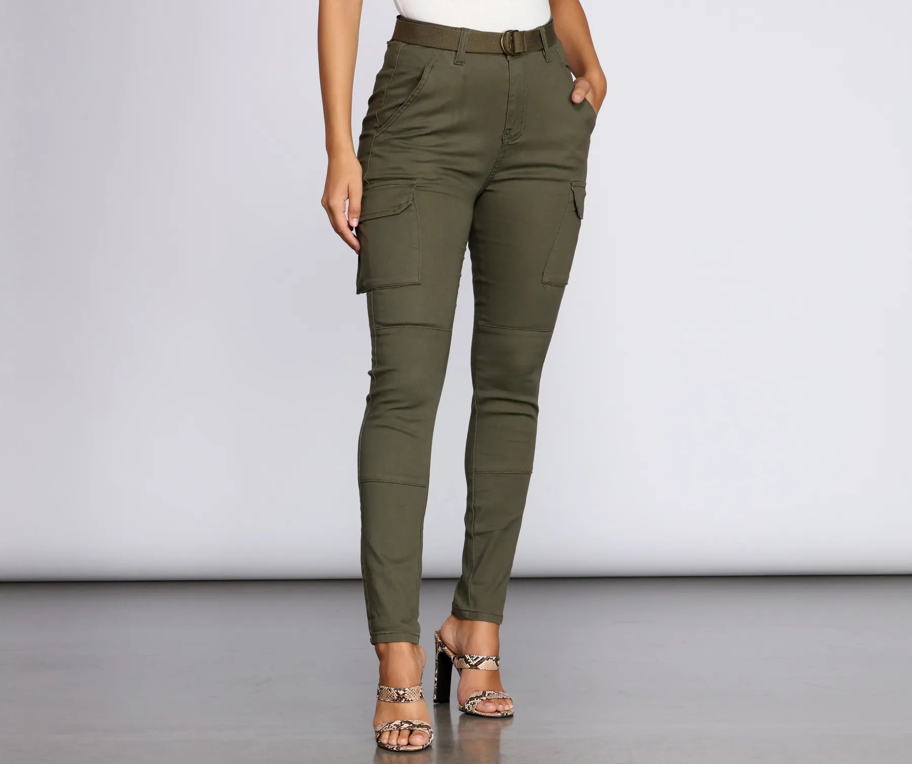 Babe. you'll be lookin' good in those skinny cargo pants! Featuring a woven belt and a tight. super-flattering fit. these bottoms are a closet staple. Pair with a basic top and add on some heels for a cute day-out look.