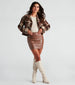 This fall. get back to basics with this faux leather mini skirt to build the perfect seasonal wardrobe! It features a sleek design with a high-rise elastic waist and a bodycon fit. Complete the look in an oversized blazer. bodysuit. and boots.