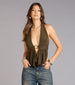 She's not just walking in—she's making an entrance. This plunge halter top drapes like a dream. with a daring front cutout and tie-back detail that keeps all eyes locked in.