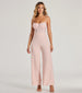 Discover this crepe jumpsuit for all of your day or night needs! It features a sleeveless floral applique corset bodice with detachable and adjustable spaghetti straps. a sweetheart neckline. a built-in padded bust. flexible boning. and crepe wide-leg bottoms with side pockets. Style with glam leaf duster earrings for dinner and drinks out!