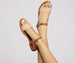 These basic and chic faux leather sandals are a wardrobe must-have this season. They feature an open round toe. a wide strap and thin adjustable ankle strap with a two-tone design. and an open back. Pair these flat sandals with a basic bodysuit and high-rise denim shorts.