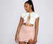 Rock a basic babe look with a crop top that will take you from day to night. The top features a crew neckline. a lace-up front. short sleeves. and a cropped hem. The top is composed of a ribbed knit fabric that offers a relaxed fit with a moderate stretch. Complete look with cutoff shorts and sandals.