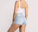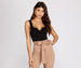 Take it up a notch in a basic bodysuit! The bodysuit features a sleeveless bodice for warmer weather. tank-like shoulder straps that offer plenty of support. and a top-notch detail to elevate this basic bodysuit. The bodysuit includes a thong bottom with dual snap button closures. Keep it casual with some distressed denim or go a little dressier with a satin midi skirt.