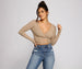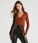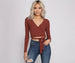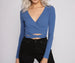 Wrap yourself in a chic ribbed top to pair with your favorite high waist jeans for an effortlessly casual outfit. The top features a plunging wrap V-neckline. long sleeves. and a cropped hem with a tie waist accent. The top is composed of a ribbed knit that offers a form hugging fit with a moderate.
