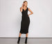 Rock those basic vibes in a dress that keeps it comfortable and chic. The everyday dress features a sleeveless bodice. a v-neckline with notched detail. and a midi length silhouette. Complete your look with chunky sneakers and a chunky necklace to create a trendy streetwear look.