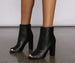 Fall back to basics in booties that are perf for your chic layered outfits. The booties feature an around the ankle fit. a peep toe. a block heel. and composed of a faux leather material. Complete look with a cardigan and high waist jeans.