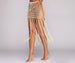Hey beauty. stun in this effortlessly pretty crochet skirt on your next vacay! It features a high rise elastic banded waist. a tie front. O-ring accents down the side and along the bottom. and long fringe hem details. The skirt is composed of a sheer crochet fabric that offers moderate stretch and a form hugging style.Â