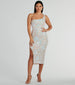 You'll be a shimmering beauty in the Beckie formal sequin dress as the stunning bride-to-be. graduate. or banquet guest! She features a sleeveless one-shoulder neckline. a tank shoulder strap. a lace-up back design. and a flattering bodycon silhouette with a side slit accent along the midi-length hem. The formal dress is composed of a sequin-scroll patterned mesh fabric with a stretchy nude knit lining. Complete the look with a glam hair accessory for a flawless style!