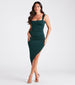 One go in this slinky midi dress. and everyone will be begging for more sights of you in it! Featuring a sleeveless square neckline. wide shoulder straps. a sexy low back with tie closure. a bodycon silhouette. and a side slit cutout. Complete the look with sleek hoop earrings.