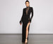 Make an extravagant entrance and bring the drama in our stunning Beka formal dress! She features a front heat stone embellished sheer mesh insert with a mock neck and a plunging V neckline. a back zipper closure. and long fitted sleeves with heat stone details and chic feather hems. Her form-hugging silhouette leads to a floor-length skirt with a sexy high slit and a heat stone adorned mesh insert. Complete your luxe look with strappy stilettos and a sparkly clutch.