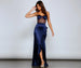 Make your grand entrance in a formal dress that brings the drama! Belle features a sleeveless sweetheart neckline with padded cups. an illusion lace bodice with heat stones. contrast piping seams. a high side slit with ruffled trim. and a mermaid silhouette. The dress is composed of a satin fabric that offers a form hugging fit with minimal stretch. Complete look with rhinestone heels.Â