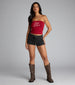 These aren't your average shorts. babe. With a built-in belt and low-rise fit. these denim shorts are made for rooftop parties. concerts. and repeat wears!