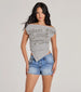 Edge up your going-out look with this vintage-inspired graphic crop top! Made with cotton-blend fabric. the tee showcases a trendy "Bikers Club" screen perfect for concerts or bar-hopping. It features a wide boat neckline that can be styled off-the-shoulder. short cap sleeves. ruching down the side seams. an asymmetric V-shaped front hem. and a cropped. form-hugging fit. Pair with a denim mini skirt.