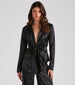 Keep it chic in this satin blazer for cocktail events! It features fitted long sleeves. a lapel collar v-neckline. tie-front and hidden hook closure. and a fitted hem. Style with high-rise bottoms to complete the look!