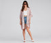 Feel the bliss of these floral blooms! Step out for spring in this crepe kimono featuring three-quarter length sleeves. an open front. and a flowy longline hem. Complete the look in a casual bodycon dress.