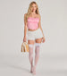 Major cutie will be your vibe this Halloween as Bo Peep in this silky satin corset top! It features a strapless sweetheart neckline with an adorable ruffled lace and tulle trim. a small bow accent at the center of the bust. a lace-up back for a customized fit. and an angled cropped hem. Complete your costume with the lace hot shorts. the wicker handbag. rhinestone earrings. and the chain-link choker necklace.