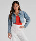 Stroll the boardwalk before your sunset dinner in this streetwear-inspired crop denim jacket featuring long sleeves with buttoned cuffs. a collared neckline. four-button front closure. flap pockets. distressed accents. and a pull tab button closure along the hem. Complete the look in breezy wide-leg pants and a bodysuit.