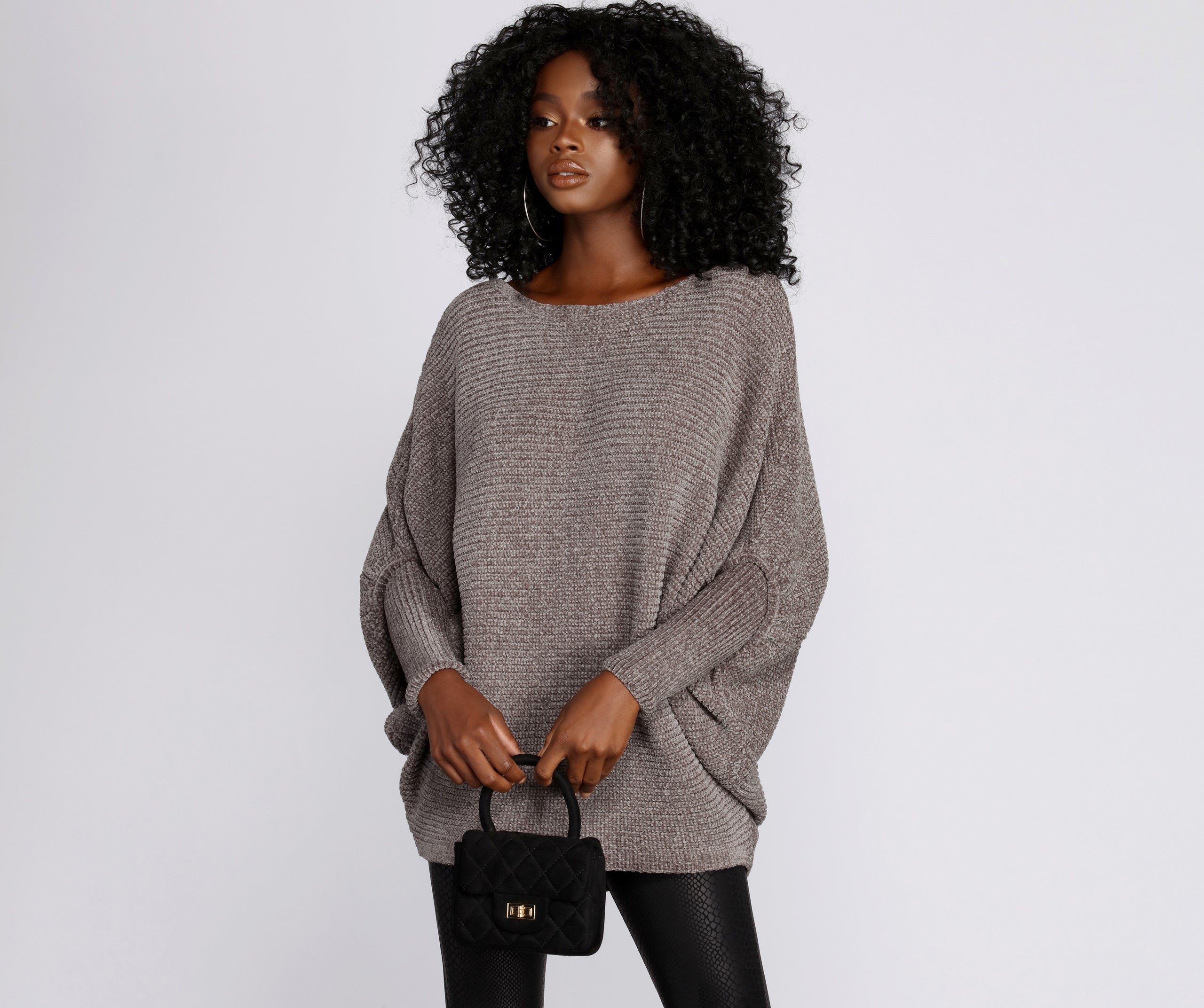 Add a touch of cozy to your winter attire! This chenille knit sweater is designed with long dolman style sleeves. a boat neckline. and a hem that hits past the waist. It has a comfy over-sized fit and is composed of a chenille knit material that offers moderate stretch.